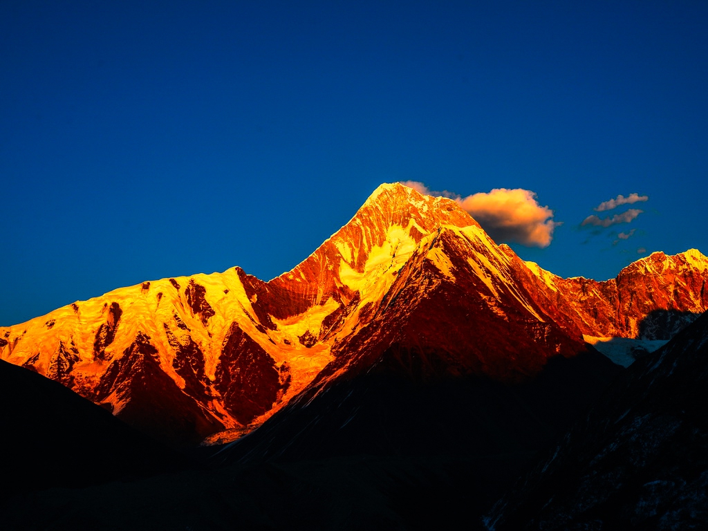 四川省贡嘎]贡嘎山(Minya Konka)坐落在青藏高原东部边缘,在横断山系的大雪山中段,位于大渡河与雅砻江之间。“贡嘎山”,藏语意为“最高的雪山”,山体南北长约60公里,东西宽约30公里,其主峰海拔7556米,地处北纬29.35.44,东经101.52.44,在四川省康定、泸定、石棉、九龙四县之间。贡嘎山海拔7556米,是四川省最高的山峰,被称为“蜀山之王”。山区高峰林立,冰坚雪深,险阻重重,是中国海洋性山地冰川十分发育的高山之一,在登山运动和科学研究中占有十分重要的地位.是一座极受登山爱好者青睐的名山。